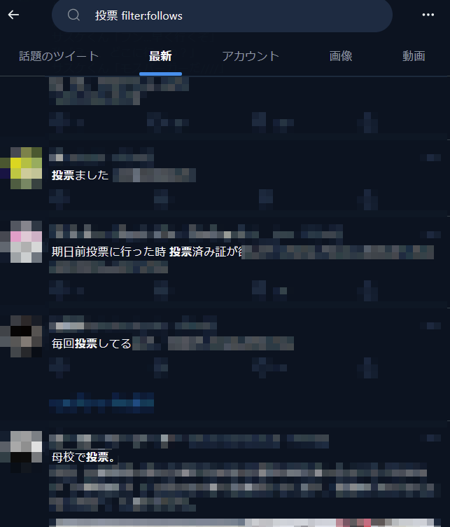 まず、Twitter検索にて「投票 filter:follows」で検索し、投票に行った旨のツイートをしているアカウントを割り出しました。