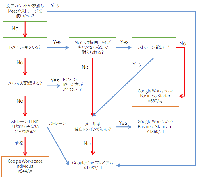 - ドメイン持ってない場合はそもそもWorkspace Businessは使えないので、ストレージでOneプレミアムを取るか価格(差額150円前後/月)でIndividualを取るかって感じ。メルマガ配信とかするならGmailの多機能さでIndividual?と思ったけどそこまでやるならドメイン取った方がいい。