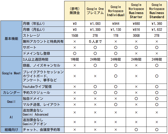 - Google Oneプレミアムはストレージのコスパが高く特典共有もできるので、複数アカウントを運用している/家族もMeetを使いたいなら優先度高。