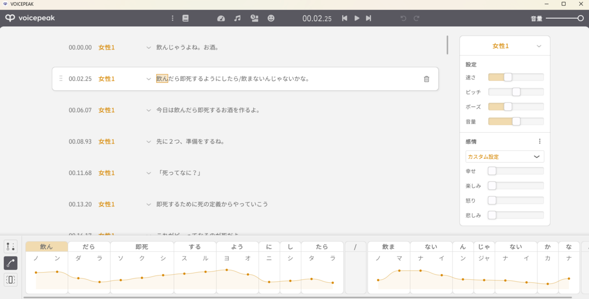 台本をVOICEPEAKに読み込ませる。発音が変なところは調整。