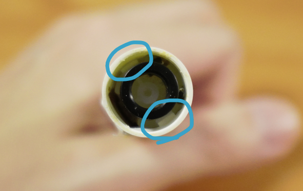 ブラシの芯(?)と基板は、樹脂部品が噛み合う角度で接続しましょう。ケースと基板の向きも慎重に揃えましょう。曲がってるとスイッチ押せなくなります。