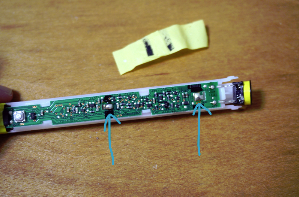 この2カ所のでかいランドが、電池用の金具です。はんだ吸い取り器か何かで外します。