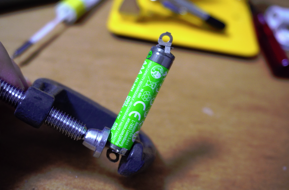電池に金具をはんだ付けするのですが、ここで悲報です。ニッケル水素電池って熱に弱いんですね。